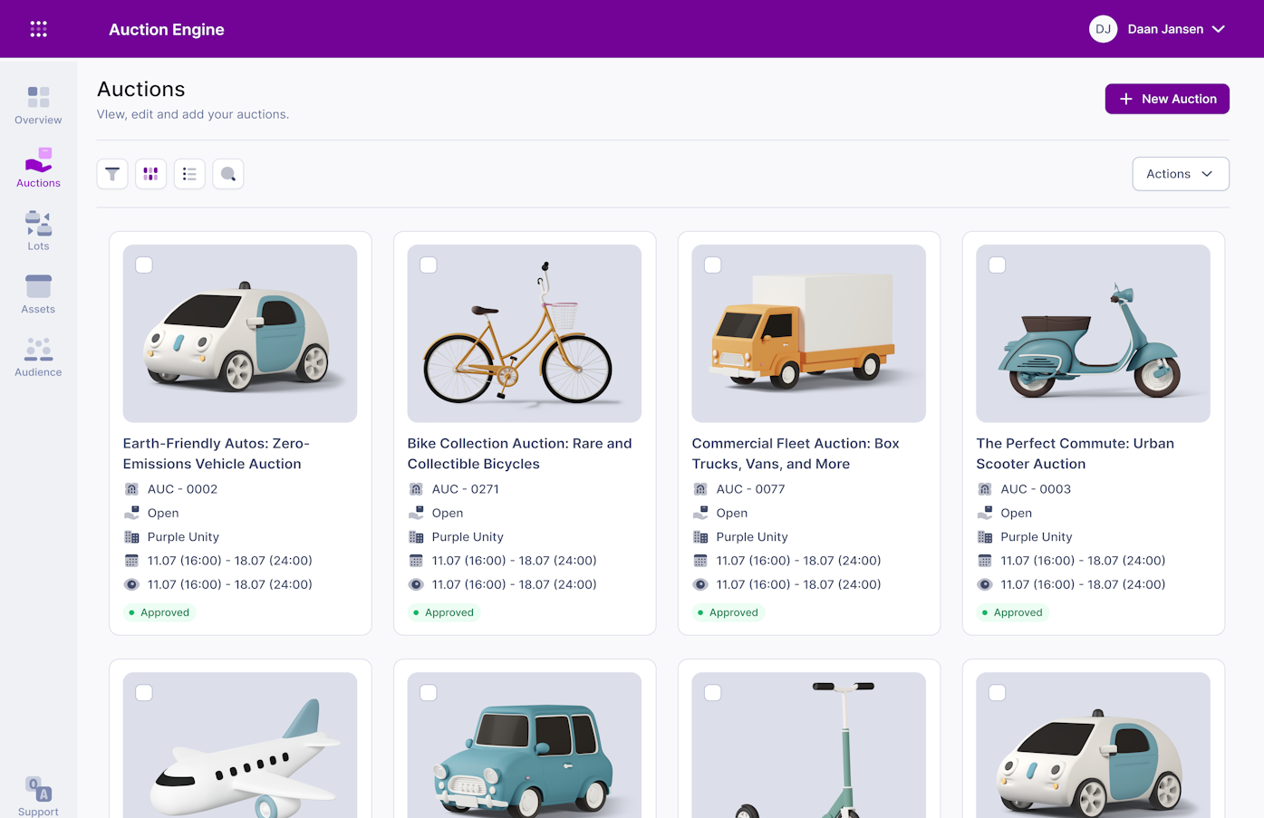 Discover the thrill of Open Auctions at Purple Unity's Auction Engine, where every bid is visible, creating a transparent and competitive atmosphere. With our Max Bidding feature, bid efficiently and let the system work for you. Experience heightened excitement with the Sliding Window feature, bringing a dynamic edge to the auction's final moments. Join our Open Auctions for a seamless, engaging, and strategic bidding journey!
